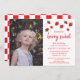Invitación de cumpleaños de fresa dulce de Berry con fruta roja y un fondo estilo tablero de ajedrez. Plantilla de foto vía Pixabay bajo licencia CC0 y debe ser reemplazada por su propia foto
