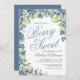 A cute 'Berry Sweet' baby shower theme featuring watercolor blueberries with green leaves. Perfect for a boy baby shower, but also works for a girl! An elegant script typography mixed with a simple serif font. Blue and navy blue fonts, but you can change them out to whatever you'd like. You can also change the background color on the backside. Berry Sweet Blueberry Baby Shower Invitation.