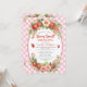 This sweet, strawberry-themed baby shower invitation features a soft pink and white gingham background that gives it a fresh, picnic-inspired feel. A white oval center provides a clean space for the event details, outlined with a subtle rosy border. At the top and bottom, lush watercolor clusters of ripe red strawberries, delicate pink blossoms, tiny berries, and leafy greenery create a charming, garden-style frame. Playful typography highlights the theme with a bold, script-style title paired with simple, modern fonts for the details, while small strawberry accents add a whimsical touch. The overall design is light, cheerful, and perfect for a spring or summer celebration.
