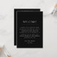 Bienvenido a sus huéspedes con estilo con esta tarjeta de itinerario de fin de semana de boda negro, con un diseño elegante de la línea de tiempo que es tan práctico como hermoso. Exponga toda la celebración -desde la cena de bienvenida hasta el brunch de despedida- para que los amigos y la familia sepan exactamente dónde y cuándo. Perfecto para bodas de corbata negra, reuniones de destino y celebraciones de varios días. Esta tarjeta le da un toque refinado y coordinado a su papelería boda mientras que los huéspedes se sienten instantáneamente incluidos en su fin de semana especial. Disponible como tarjeta impresa o descarga digital para una fácil impresión.