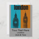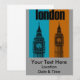 El diseño Big Ben In London incorpora dos imágenes gráficas negras del Big Ben. Las imágenes del Big Ben están en dos franjas audaces. Una banda es un color naranja quemado y negrita, mientras que la otra es de color azul claro. En la parte superior del gráfico de Londres está la palabra londres en un tipo de letra negrita y negra. Este Big Ben en Londres, Ver. 2 es un diseño de arte pop que celebra la ciudad de Londres.