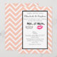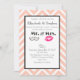 Una invitación de boda de estilo moderno con labios besando rosados y una ilustración de bigote con aspecto retro. Sobre un fondo de chevron melocotón. Personalice con todos los detalles de su boda.