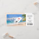 Una invitación de boda divertida pero elegante en un estilo de tarjeta de embarque/entrada para parejas casadas en el extranjero en Ibiza que se muestra en una silueta de mapa blanco en la escena de la playa y la palmera, con corazones de amor rojo dulce, silueta de avión y forma de corazón giratorio. El reverso de la tarjeta de embarque tiene un elegante patrón de encaje de bonito.