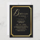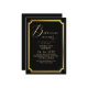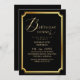 Modern stylish birthday party invitation black with gold dust on with a gold ink pour effect (the gold is a digital effect, not real foil) and modern calligraphy. Classy and elegant, simple and modern invitation.
