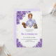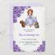 Birthday invitation with a fairy-tale theme. Features a princess in a blue dress and animals, surrounded by purple roses. Text reads "Sue is turning one."