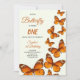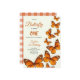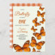 A first birthday invitation card with vibrant orange butterflies on a white background. Elegant script text details event info. The tone is cheerful and celebratory.
