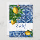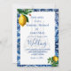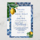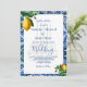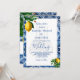 Lemones sobre un fondo de Bismillah azul y blanco de estilo mediterráneo toscano. La información se cambia fácilmente a la invitación de su propio personalizado. El monograma se cambia fácilmente para sus iniciales. Los colores limón y azul.