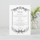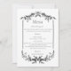 This elegant wedding menu features a classic black-and-white design with refined botanical flourishes framing the top and bottom. Delicate vertical lines and ornamental greenery create a timeless, formal look, while graceful typography guides the eye through each course. The layout is clean and well-balanced, presenting hors d’oeuvres, dinner courses, and dessert in a polished, understated style that complements traditional, romantic, or modern-classic wedding celebrations.