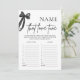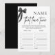 Prueba el conocimiento musical de tus invitados con este divertido y elegante juego de ducha de novia "Name That Love Tune" 🖤 🎀! Con un minimalista diseño de arco negro de moda, este juego desafía a los invitados a adivinar el nombre de populares canciones de amor basadas en letras cortas o melodías 🎶 💕. Una manera perfecta de añadir emoción y nostalgia a una elegante y sofisticada ducha de novias. Personalice e imprima para una celebración inolvidable.