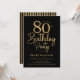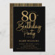 Black gold 80th birthday party invitation. Trendy modern design, perfect for a stylish men's or women's bday celebration. Features script font and stripes on the back. Customize with your own details. Printed Zazzle invitations or instant download digital printable template.