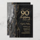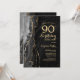 Invitación a la fiesta de cumpleaños número 90 en negro y oro. Elegante diseño moderno con fondo geodésico de mármol agate acuarela, oro falso purpurina y tipografía de escritura. La carta de invitación de moda es perfecta para una elegante celebración del cumpleaños de las mujeres. Invitaciones Zazzle impresas o una plantilla imprimible digital de descarga instantánea.