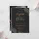 En dos esquinas de este elegante diseño aparece un diseño de agate acuarela negro adornado con un falso purpurina dorado. Personalízalo con los nombres de la pareja en un guión de escritura a mano de color dorado sobre una gran ampersand gris. Añada los detalles del boda en copperplate de color dorado y tipografías cursivas en un fondo no negro. El reverso presenta un diseño de agate negro y oro a juego.