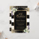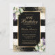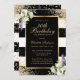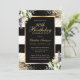 Elegante invitación de 30 años a rayas blancas y negras con un marco dorado decorado con confeti dorado, lirios de calila y vegetación.