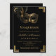 Invite your guests to an evening of mystery and sophistication with this elegant black and gold masquerade invitation. The design features a beautifully detailed Venetian-style mask with feather accents and refined gold typography — a timeless choice for a formal or black-tie celebration.