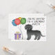 Diseño temático de cumpleaños lindo con el ilustracion original de Destei, personalizado de un lindo perro de raza Goldendoodle color abrigo negro en miniatura. Al lado del perro hay globos de cumpleaños coloridos atados sobre un hueso de perro y una caja de regalo de color morado y amarillo. El fondo está decorado en tonos pastel y con un fondo blanco. Personalice las áreas de texto de ejemplo con los detalles de su evento.