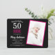 Una bella, rosa y negra invitación a la fotografía de 50 años, te puedes personalizar y enviar para tu fiesta de 50 años. Las palabras "50 and Fabulous" se utilizan en la tipografía popular. Reemplace la foto de ejemplo con la suya propia. Los colores de texto rosa y negro se pueden cambiar utilizando el menú de edición. Un patrón de puntos rosa y blanco adorna la parte posterior de la tarjeta. Hay otros colores y patrones disponibles.