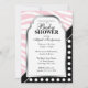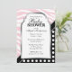 Impresión de cebra de diseño y única Baby Shower invitaciones que incluyen un diseño dividido con un patrón de rayas de cebra rosa y blanco por una parte, un patrón de puntos de polka en blanco y negro por otra parte, y personalizado impreso con los detalles de tu celebración.