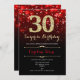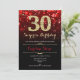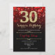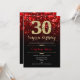 Sorpresa 30.ª invitación a la fiesta de cumpleaños. Elegante diseño negro rojo con falso oro purpurina. Cuenta con diamantes elegantes, luces de bokeh y fuente de guiones. Invitación de cumpleaños de hombres o mujeres. Perfecto para una elegante fiesta de cumpleaños. Personaliza con tus propios detalles. Mándame un mensaje si necesitas más personalización. Invitaciones Zazzle impresas o una plantilla imprimible digital de descarga instantánea.