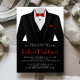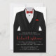 Esta elegante invitación a la fiesta de cumpleaños de los hombres muestra una imagen de un esmoquin negro con camisa blanca y corbata de arco rojo y pañuelo de bolsillo. La invitación y los detalles aparecen en sans serif blancos, con el nombre del invitado de honor en una fuente inspirada en el art deco rojo. La espalda es negra sólida.