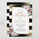 Elegante invitación de cumpleaños florido en blanco y negro con flores de color rosa y verde que enmarcan los detalles de la fiesta de cumpleaños dentro de un marco dorado con fondo blanco y negro adornado con confeti dorado. Invitación de cumpleaños floral de Rubor. Invitación de Rubor y de oro para el cumpleaños. Invitación de cumpleaños rosa y dorado. Invitación de cumpleaños rosada. Invitación de cumpleaños en negro y oro. Invitación de cumpleaños en blanco y negro. Personalice fácilmente esta plantilla a cualquier fiesta de cumpleaños.