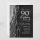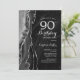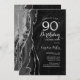 Invitación a la fiesta de cumpleaños 90 en negro y plata. Elegante diseño moderno con fondo geodésico de mármol agate acuarela, letra falsa purpurina plateada y tipografía. La carta de invitación de moda es perfecta para una elegante celebración del cumpleaños de las mujeres. Invitaciones Zazzle impresas o una plantilla imprimible digital de descarga instantánea.