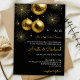 Black wedding invitation with gold text and glittering ornaments. Fireworks and baubles convey a festive New Year’s Eve theme. Elegant and celebratory.
