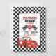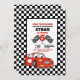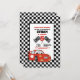 Invitación a la fiesta de cumpleaños 5 del entrenador de niños con un auto rojo brillante y dos banderas de cuadros negros y blancos en un fondo de cuadros negros y blancos Texto dice, "Comienza tus motores y únete a la celebración" e incluye el nombre del niño de cumpleaños, fecha, ubicación del fiesta y la información de rsvp. Esta tarjeta está diseñada para una fiesta de cumpleaños de un niño de cinco años, pero puedes cambiar fácilmente el número y diseñar tu tarjeta para un niño de cualquier edad.