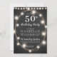 Un elegante y moderno cumpleaños personalizado invita a la estrella del fiesta. Simple invitación de fiesta de 50 años en blanco y negro con brillantes luces de cadena de estrellas, un nombre de tipo de cara abierta clásico contrastado con un encantador tipo de guión. La tipografía rodeada de luces brillantes.