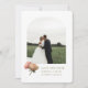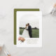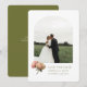 Moderna y moda. Esta encantadora boda, salvo la tarjeta de fecha, cuenta con un hermoso ramo de rosas voluptuosos contra el fondo blanco y verde oliva. El diseño incluye una foto en un marco de arco boho, un conjunto contemporáneo de fuentes en verde oliva en la parte delantera y texto opcional adicional en la parte posterior.