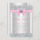 Invitación a la ducha de bebé rosa y plateado con un arco de diamante rosa y plateado sobre un elegante fondo de rombo de diamante. Esta invitación a la ducha de bebé rosa y gris bling se personaliza fácilmente para tu evento.