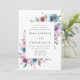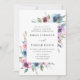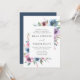 Elegantes invitaciones florales para bodas mostrando sus detalles bodas enmarcados por un borde de flores moradas, malvas y azules de acuarela con frondosas hojas verdes. La parte posterior tiene un fondo azul oscuro sólido. Diseñado para coordinar con nuestra colección de bodas de Blooms de Medianoche.