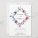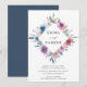 Elegantes invitaciones florales de boda mostrando sus nombres dentro de un marco geométrico de flores de color morado, malva y azul acuático con frondosas hojas verdes. Personalice las invitaciones florales moradas y azules añadiendo a continuación los detalles de su boda. La parte posterior tiene un fondo azul oscuro sólido. Diseñado para coordinar con nuestra colección de bodas de Blooms de Medianoche.