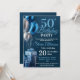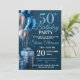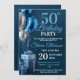 Un elegante globo azul y diseño de regalo para una celebración de 50 años. Incluye globos azules y plateados con texto en blanco y azul.