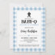 Celebrate a little one on the way with this baby-q backyard barbecue party invitation that features a soft blue and white gingham plaid patterned frame with a small BBQ and grilling tools icons. Customize the invitation text with your party details or change the colours and fonts. Includes a BBQ food and tool icon print for the backside. Matching items available in the 'Baby-Q Blue' collection.
