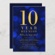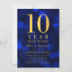 Invitación a una reunión de clase con las palabras "Reunión de los 10 años" en un falso Relieve metalizado de oro contra un fondo azul de luces de bokeh. La invitación tiene un fondo azul en la parte posterior. Personalice esta invitación con sus detalles reemplazando el texto del marcador de posición. Para obtener más opciones, como cambiar el tipo de letra, el tamaño/color del texto o el espaciado entre letras, haga clic en el botón "Personalizar". *Tenga en cuenta que la marca de agua Zazzle que aparece en la vista previa del zoom NO aparecerá en el producto impreso final. © Rosewood y Citrus