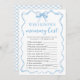 Este divertido juego de ducha para bebés presenta un bonito diseño de arco azul que combina perfectamente con el tema de la ducha para bebés. Los invitados están invitados a responder preguntas sobre la futura mamá, a probar sus conocimientos sobre sus cosas favoritas, sus peculiaridades y sus divertidos datos. Desde los antojos favoritos hasta sus aficiones, este juego ofrece una manera alegre de celebrar la conexión especial entre mamá y sus seres queridos. Es un hipnotizador ideal, que reúne a los huéspedes en una divertida competencia para ver quién conoce mejor a mamá. El elegante arco azul de la parte superior combina el juego con la decoración general de su evento. Este juego no sólo entretendrá a los invitados, sino que también creará recuerdos duraderos para la futura mamita.