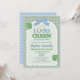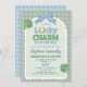 Invite your friends and family to shower the mom to be of a little lucky charm! With a blue bow at the top of an arch-shaped background, a lucky horseshoe in the word Lucky, and two four leaf clovers for extra good luck. The details are drawn digitally by hand. The background is a cottagecore cute gingham pattern in sage green.