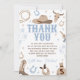 Send a big "Thank You" from the wild west! This matching thank you card features a rustic cowboy hat and desert elements in blue and tan. Perfect for thanking guests for attending your son's "How the West Was One" first birthday celebration. A sweet and stylish way to show your gratitude.
