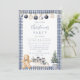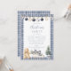 A charming Christmas invitation featuring navy blue gingham borders, watercolor ornaments, and a cozy vignette of a gingerbread cookie, sleigh of gifts, and festive tree. The design blends classic holiday warmth with elegant blue tones — perfect for chic winter gatherings or family celebrations.