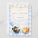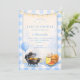 A fresh summer Baby-Q design featuring soft blue gingham, warm string lights, and a charming watercolor grill scene. A blue balloon, fresh lemonade, watermelon slices, and picnic basket details create a light and cheerful backyard atmosphere. The structured inner frame keeps the center clean and airy for event wording, while the illustrated cookout scene anchors the bottom with playful charm. Perfect for a spring or summer outdoor baby shower with a sweet picnic vibe.