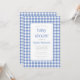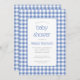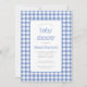 Esta invitación a la ducha para bebés tiene un fondo rústico de gingham marcado en azul y blanco. El texto aparece en un rectángulo blanco con un borde azul fino y esquinas redondeadas, con las palabras "baby ducha" y el nombre de la futura madre en una tipografía azul encantadora y el texto restante en letras grises sans serif. Ideal para la ducha de bebé de un niño. El patrón de gingham se repite en la parte posterior de la tarjeta.