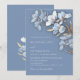This elegant wedding invitation features AI created white 3 dimensional blue and gold flowers on a dusty blue background.