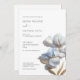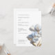 This elegant artistic wedding invitation features AI created white 3 dimensional blue and rose gold flowers.
