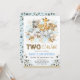 Invitación de cumpleaños número 2 con tema safari con hojas de acuarela tropicales azules y doradas y un grupo de adorables animales de la jungla