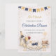 Blue and gold celebration theme, script typography, soft neutral backdrop with banner flags, champagne display, cake detail, and table setting elements. Designed for hosting formal dinners, milestone gatherings, or evening celebrations with a refined and polished event setup.
