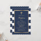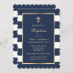 Elegante invitación al bautismo de rayas azules y blancas que exhibe una cruz de oro, un marco y pequeñas estrellas.