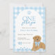 Celebra el primer cumpleaños de tu pequeño con esta invitación de cumpleaños de "Un año dorado". Esta adorable invitación incluye gingham azul, un recuperador dorado con un arco azul y reproducciones de pata. Perfecto para las familias amantes del perro, este dulce diseño le da un toque encantador a cualquier fiesta de cumpleaños.