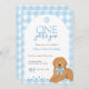 Celebrate your little boy's first birthday with this "One Golden Year" birthday invitation. This adorable invitation features blue gingham, a golden doodle wearing a blue bow, and playful paw prints. Perfect for dog loving families, this sweet design adds a charming touch to any first birthday party.