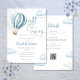 Esta encantadora invitación a la ducha de bebé incluye un bonito globo de aire caliente azul y nubes, junto con una elegante tipografía de guiones. Con el código QR del Registro y los detalles del evento al revés. Diseñado por Thisisnotme©