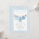 The COLBY blue jean baby shower invite design features a white and light blue denim stripes background with a clothesline full of denim baby clothes, bib and denim baby sneakers, paired with the phrase 'a blue jean baby is on the way' in a light blue script and serif font pair, with the other blue jean themed baby shower details in grey to your blue jean baby shower invitation. Personalize this denim baby shower invitation by adding names, date, time, venue and other details. A back is included with a denim and white stripe pattern.